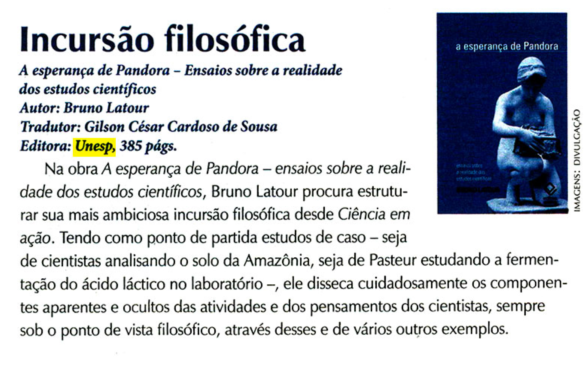 A revista Filosofia Ciência e Vida, em sua edição de junho, destacou o livro A esperança de Pandora: ensaios sobre a realidade dos estudos científicos, de Bruno Latour. Nesta obra, Latour estrutura sua mais ambiciosa incursão filosófica desde Ciência em ação. Tendo como ponto de partida estudos de caso – seja de cientistas analisando o solo da Amazônia, seja de Pasteur estudando a fermentação do ácido láctico no laboratório –, ele disseca cuidadosamente os componentes aparentes e ocultos das atividades e dos pensamentos dos cientistas.