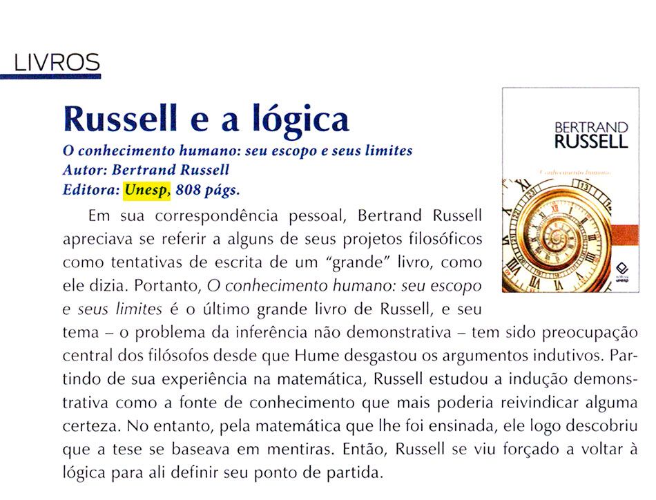 A revista Filosofia Ciência e Vida recomendou a leitura de Conhecimento humano: seus escopos e seus limites, de Bertrand Russell. E o último grande livro de Russell, e seu tema – o problema da inferência não demonstrativa – tem sido preocupação central dos filósofos desde que Hume erodiu os argumentos indutivos.