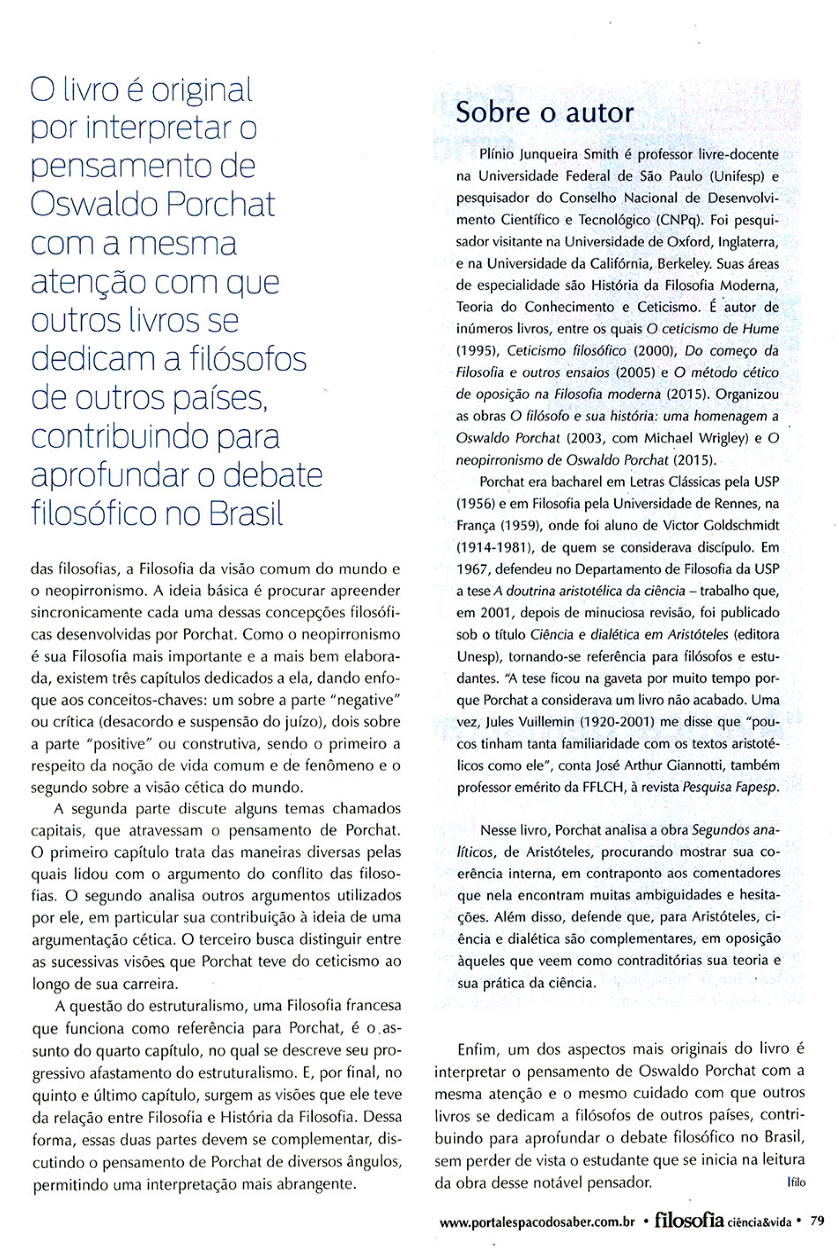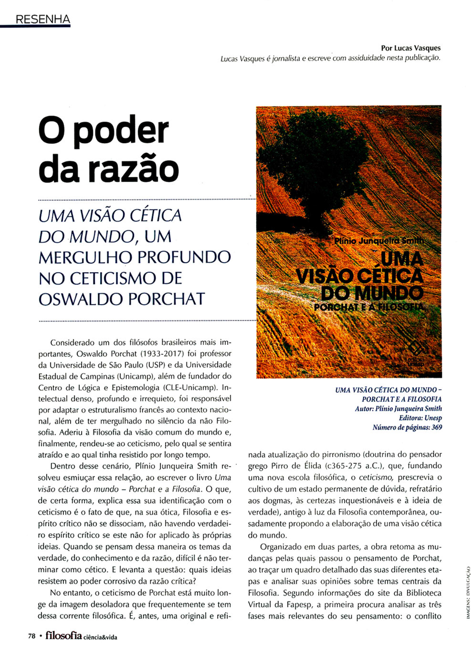 A revista Filosofia Ciência e Vida, em sua edição de junho, resenhou o lançamento Uma visão cética do mundo: Porchat e a filosofia, de Plínio Junqueira Smith. Organizado em duas partes, este livro retoma todas as mudanças pelas quais passou o pensamento de Porchat, ao traçar um quadro detalhado das suas diferentes fases e examinar suas opiniões sobre temas centrais da filosofia.