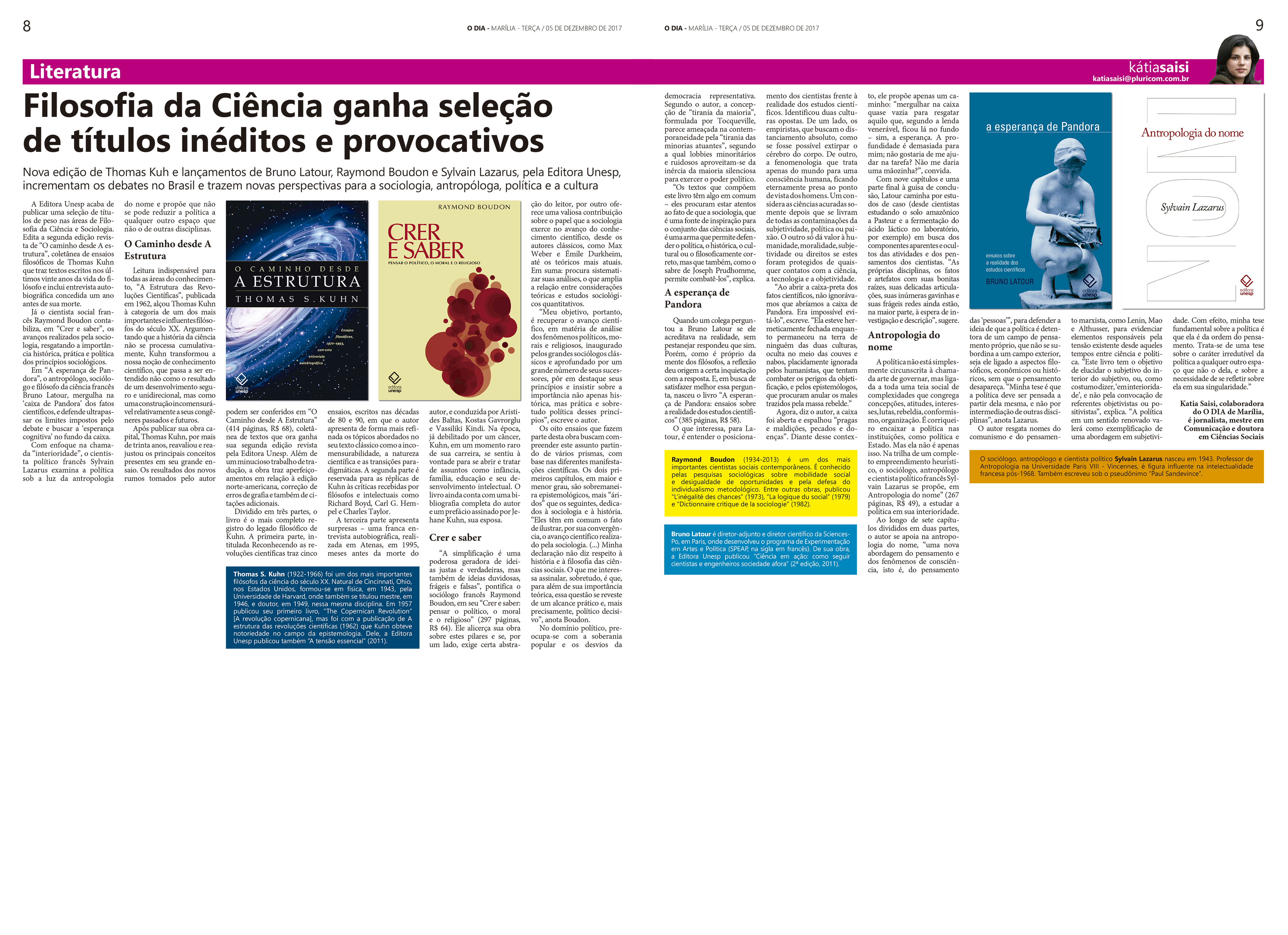 O jornal O Dia de Marília, em sua edição de 5 de dezembro, destacou os lançamento O caminho desde A estrutura – 2ª Edição, de Thomas S. Kuhn; Crer e saber, de Raymond Boudon; A esperança de Pandora, de Bruno Latour e Antropologia do nome, de Sylvain Lazarus.