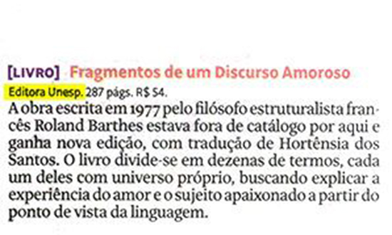 O caderno Ilustríssima, do jornal Folha de S.Paulo, indicou, no dia 13 de janeiro, a leitura do lançamento da Editora Unesp Fragmentos de um discurso amoroso, de Roland Barthes.