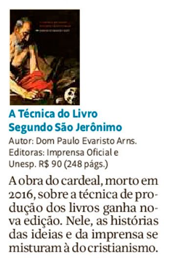 A Folha de S.Paulo, em sua edição de 29 de dezembro de 2018, recomendou a leitura de A técnica do livro segundo São Jerônimo, de Dom Paulo Evaristo Arns. Este livro descreve com exatidão filológica o longo processo de composição da escrita. Estuda toda uma série de elementos que vão desde o tipo de suporte usado (o papiro, o pergaminho, as tabuletas de cera com o estilete), até, na outra ponta, aspectos ligados à difusão da obra, passando metodicamente pelas etapas da redação e das várias modalidades de edição.