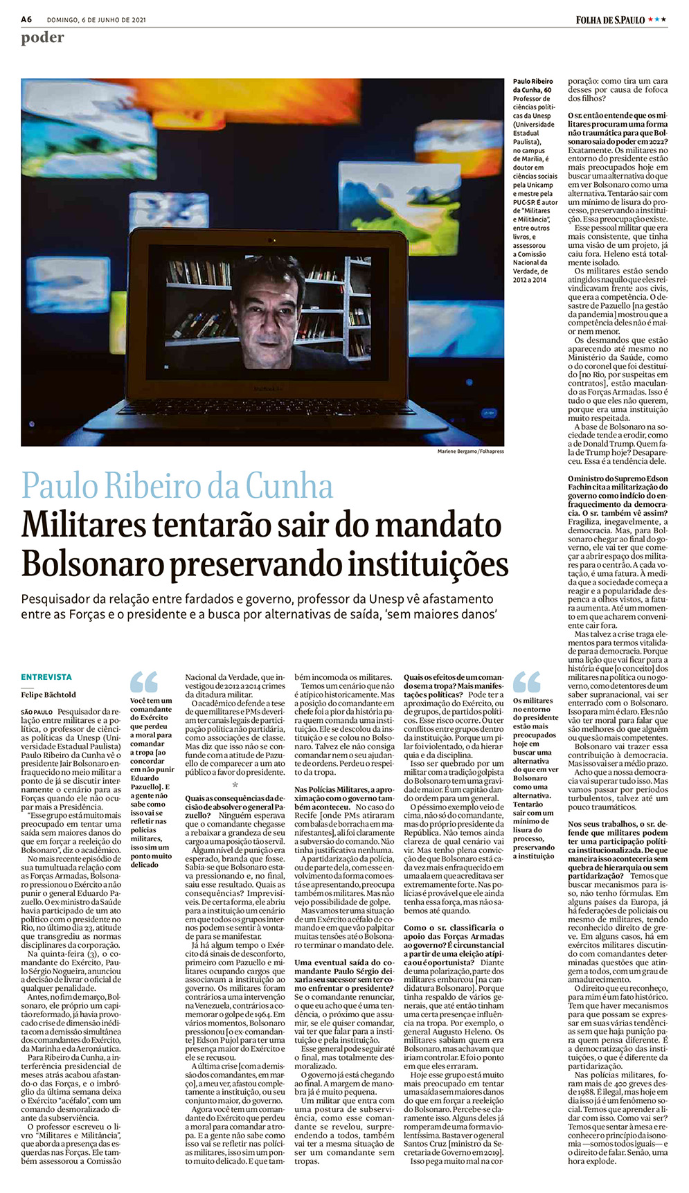 "Pesquisador da relação entre militares e a política, o professor de ciências políticas da Unesp (Universidade Estadual Paulista) Paulo Ribeiro da Cunha vê o presidente Jair Bolsonaro enfraquecido no meio militar a ponto de já se discutir internamente o cenário para as Forças quando ele não ocupar mais a Presidência", escreveu o jornalista Felipe Bächtold.