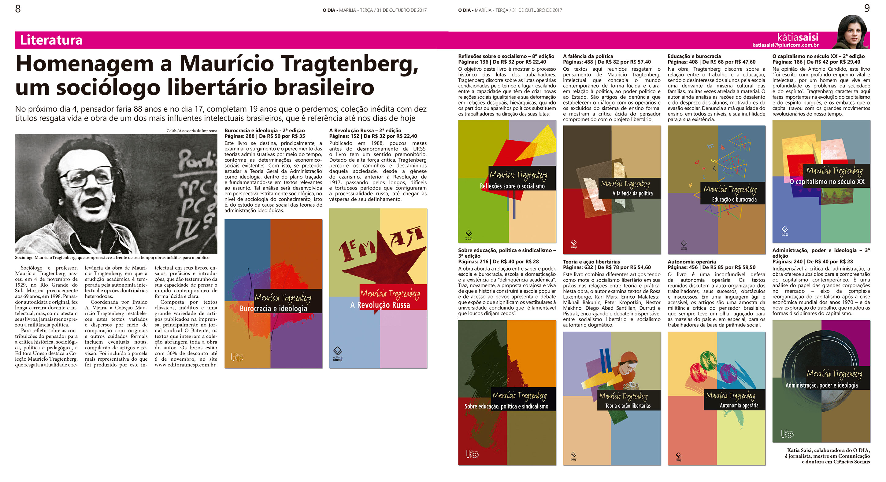 O jornal O Dia de Marília, em sua edição de 31 de outubro, destacou o aniversário de Maurício Tragtenberg e as contribuições do sociólogo. Os livros da Coleção Tragtenberg estão com 30% de desconto até 6 de novembro. Confira aqui.
