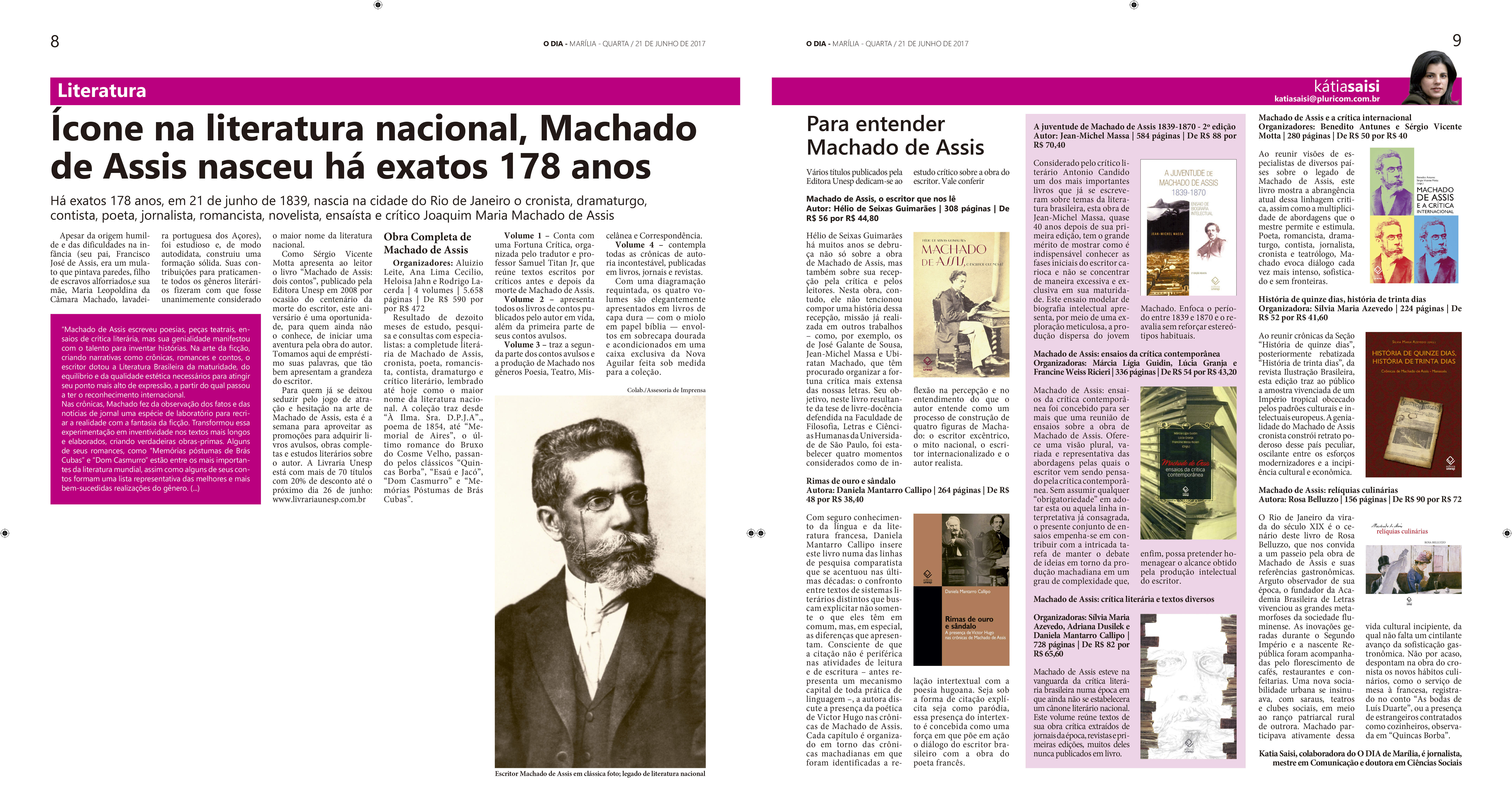 O jornal O Dia de Marília, em sua edição de 21 de junho, destacou o aniversário de Machado de Assis e os livros da Editora Unesp sobre o autor. O livros estão com desconto até 26 de junho, confira aqui.