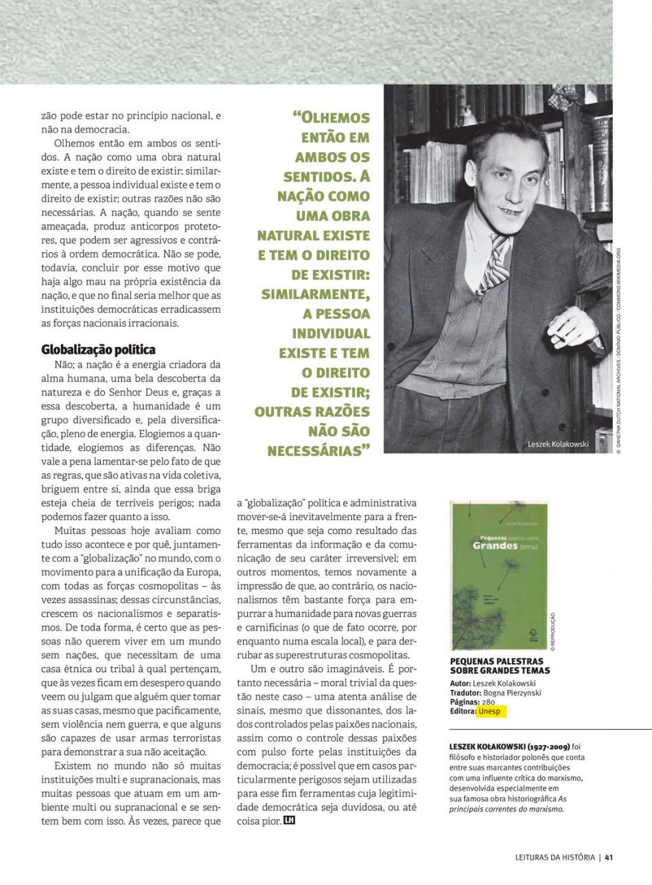 Leszek Kolakowski, autor da publicação da Editora Unesp Pequenas palestras sobre grandes temas, teve sua obra destacada pela Leituras da História. A revista apontou os ideais do filosofo e historiador polonês sobre a democracia.