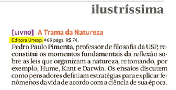 A Ilustríssima, do jornal Folha de S.Paulo, em sua edição de 22 de julho, recomendou a leitura do lançamento A trama da natureza: organismo e finalidade na época da Ilustração, de Pedro Paulo Pimenta.