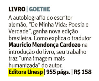 O caderno Ilustríssima do jornal Folha de S.Paulo indicou, em sua edição de 22 de outubro, o lançamento De minha vida: poesia e verdade. Nesta obra monumental, o mestre alemão se debruça sobre sua própria história, desde sua infância, e sobre sua relação com os homens do seu tempo. Desfilam aos olhos do leitor suas impressões sobre política, arte, história e metafísica.