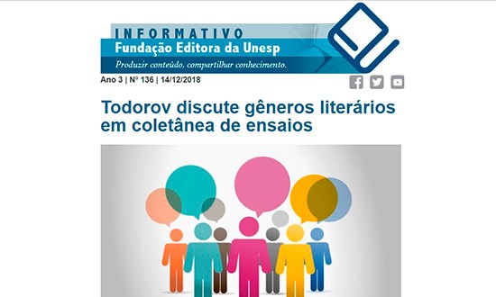 O lançamento de Os gêneros do discurso, de Tzvetan Todorov; a participação da Editora Unesp na Feira de Livros da Cultura e na Feira de Livros da Imprensa Oficial e os descontos dos livros de Sociologia são alguns dos destaques do Informativo da Fundação Editora Unesp desta semana. Leia aqui a edição na íntegra.