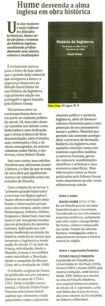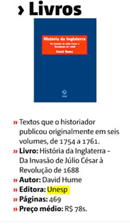 Em 20 de fevereiro, o Jornal de Brasília indicou, assim como o jornal Agora, do Rio Grande do Sul, em 26 de janeiro, a leitura do lançamento da Editora Unesp, História da Inglaterra, de David Hume.