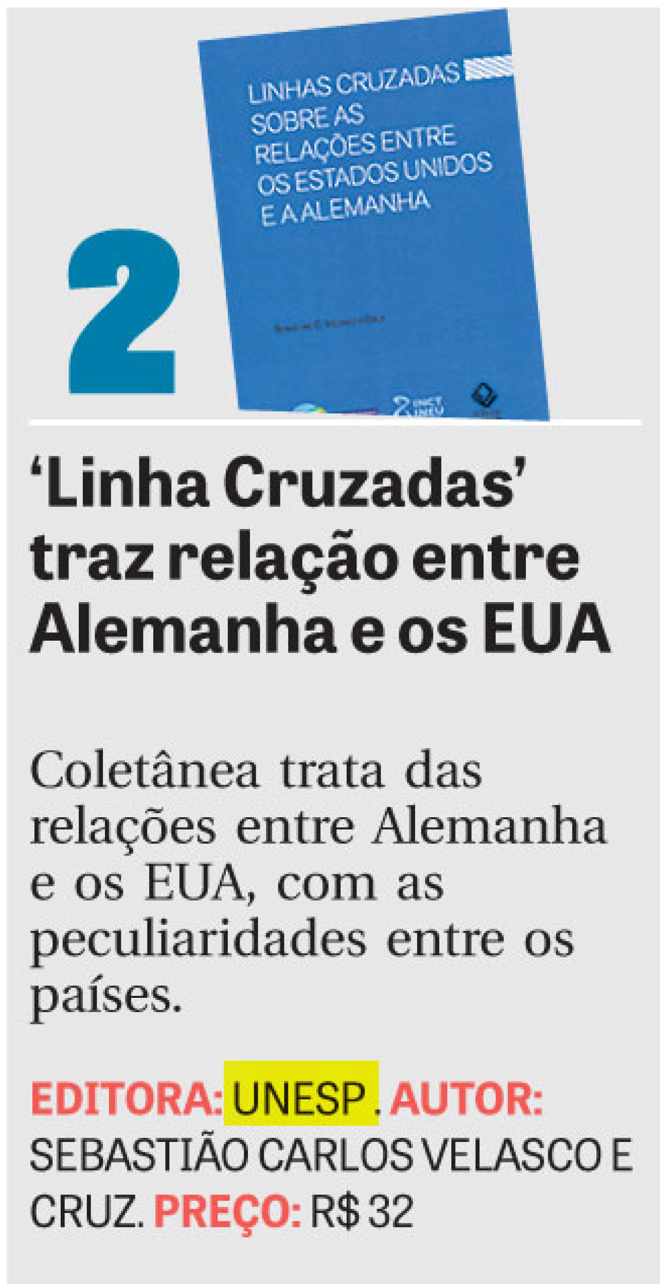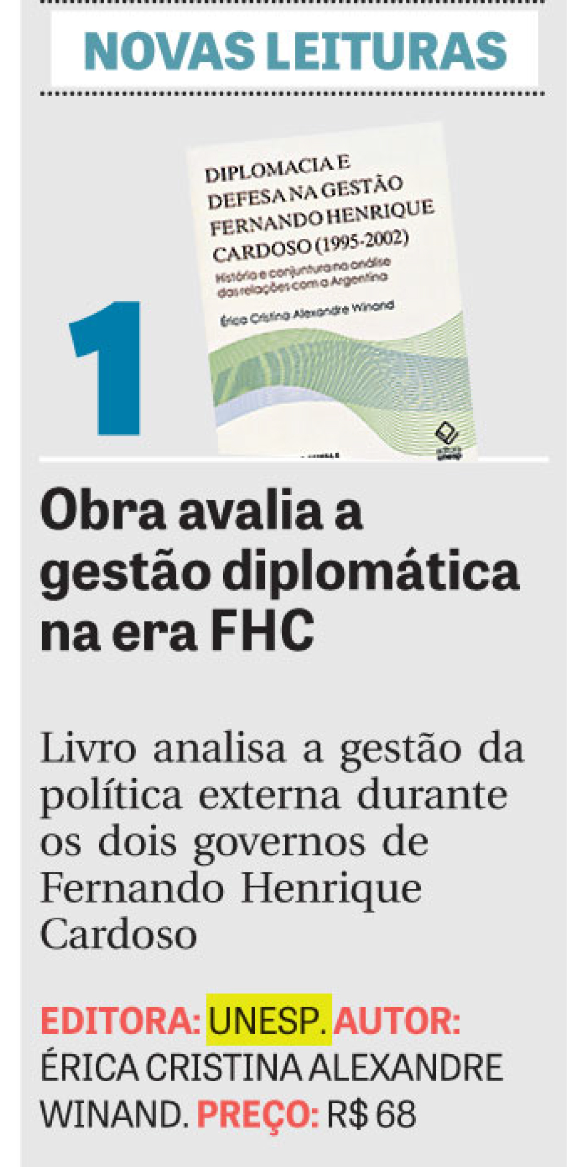 O jornal DCI indicou em 6 de abril de 2017, na coluna sobre novas leituras, os livros Diplomacia e defesa na gestão Fernando Henrique Cardoso (1995-2002), de Érica Cristina Alexandre Winand e Linhas cruzadas sobre as relações entre os Estados Unidos e a Alemanha, de Sebastião Carlos Velasco e Cruz.