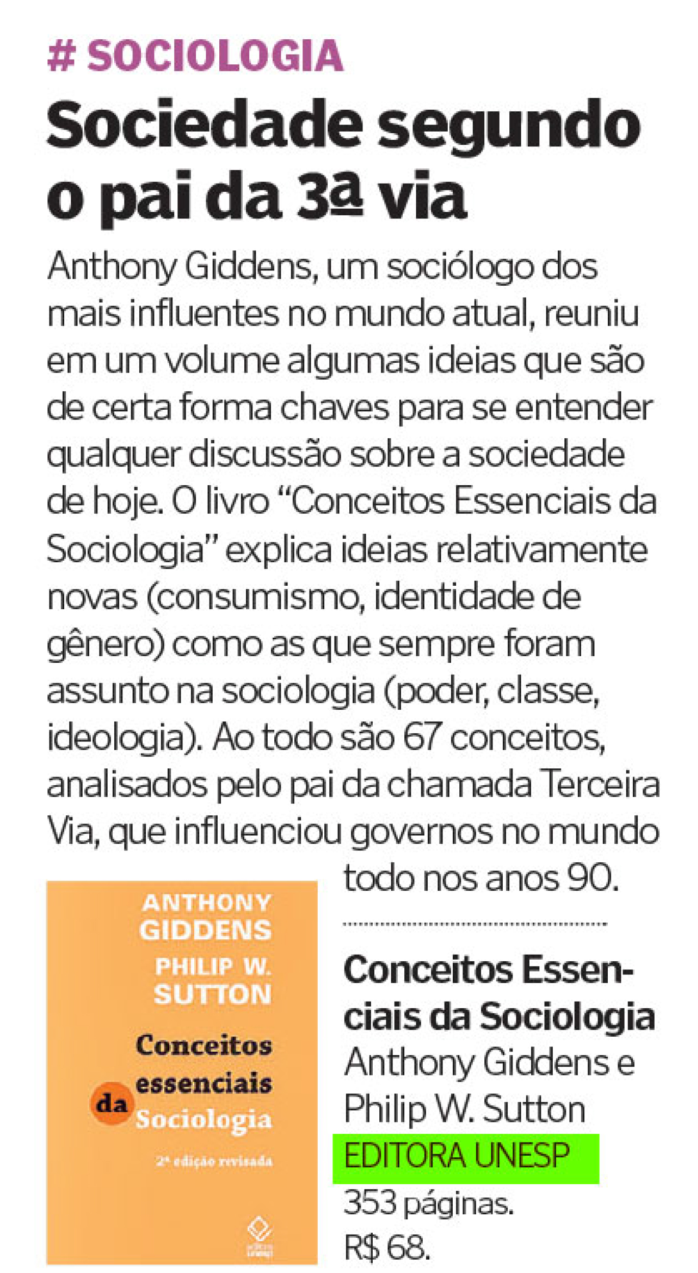 O jornal Destak indicou a leitura do livro Conceitos essenciais da Sociologia - 2ª edição, de Anthony Giddens, Philip W. Sutton. O livro, agora lançado em edição revista, é uma espécie de manual contemporâneo da Sociologia, apresentando 67 de seus conceitos essenciais. Com uma linguagem clara e concisa, Anthony Giddens e Philip W. Sutton explicam terminologias e ideias fundamentais dessa disciplina, bem como suas origens e suas aplicações contemporâneas, obtendo, ao final, uma obra que fornece um panorama atualizado dos desenvolvimentos da Sociologia nos últimos 150 anos.