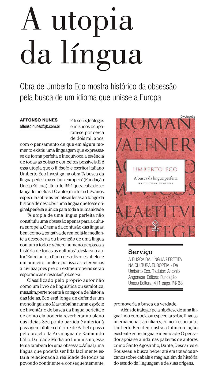 O Jornal do Brasil, em sua edição de 4 de março, indicou a leitura de A busca da língua perfeita na comunidade europeia, de Umberto Eco. Neste livro, Umberto Eco investiga esse projeto utópico de se descobrir uma língua original, perfeita e única para todo o gênero humano.