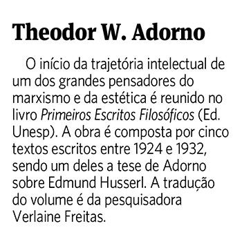 O Jornal do Commércio destacou o lançamento Primeiros escritos filosóficos, de Theodor W. Adorno. A obra é composta por cinco dos textos fundamentais produzidos por Theodor Adorno em sua juventude, mais especificamente entre 1924 e 1932: “A transcendência do coisal e do noemático na fenomenologia de Husserl”, “O conceito de inconsciente na doutrina transcendental da alma”, “A atualidade da filosofia”, “Ideia da história natural” e “Teses sobre a linguagem do filósofo”. Tais escritos abrem uma importante janela para o primeiro momento do trabalho filosófico de Adorno e permitem estabelecer conexões e contrastes com seu pensamento ulterior.