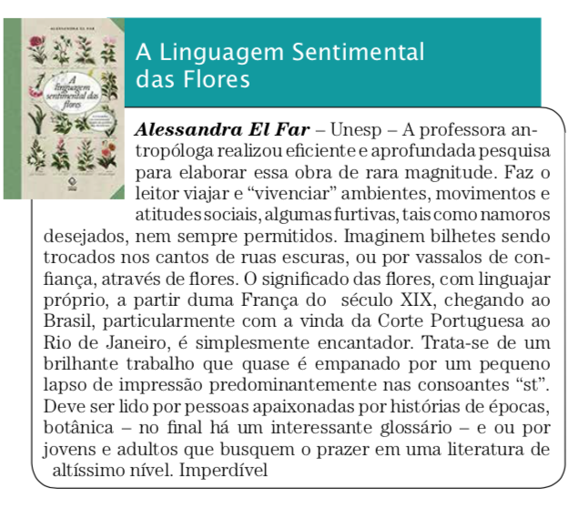 O jornalista Ralph Peter recomendou em sua coluna no Jornal Empresas e Negócios a obra A linguagem sentimental das flores e o namoro às escondidas no Rio de Janeiro do século XIX, da antropóloga Alessandra El Far.