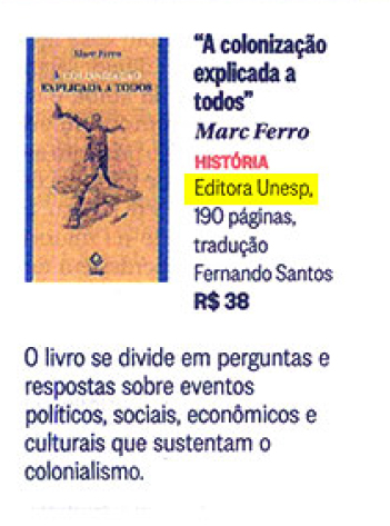 O jornal O Globo, em sua edição de 7 de outubro, indicou a leitura do lançamento A colonização explicada a todos, de Marc Ferro. De forma didática e atenciosa, o autor aborda neste livro o processo colonizador, em especial aquele levado a cabo pela Europa no além-mar entre os séculos XVI e XX. Alicerçado nos domínios da história, o autor lança luz sobre os eventos políticos, sociais, econômicos e culturais que sustentam o colonialismo e que, assim, dão origem a novas sociedades – das quais nem todas sobrevivem.