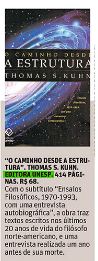 O jornal O tempo, em sua edição de 2 de dezembro de 2017, indicou a leitura de O caminho desde A estrutura – 2ª Edição: Ensaios filosóficos, 1970-1993, com uma entrevista autobiográfica. de Thomas S. Kuhn. Dividido em três partes, O caminho desde A estrutura é o mais completo registro disponível dos novos rumos que Thomas Kuhn estava trilhando durante as últimas duas décadas de sua vida. A primeira parte do livro consiste de ensaios tópicos nos quais o autor refina os conceitos fundamentais elaborados em A estrutura. Na segunda parte, Kuhn responde extensivamente às críticas dirigidas a suas contribuições anteriores. A terceira parte do volume é composta pela transcrição de uma notável entrevista autobiográfica concedida por Kuhn em Atenas, em 1995, menos de um ano antes de sua morte.