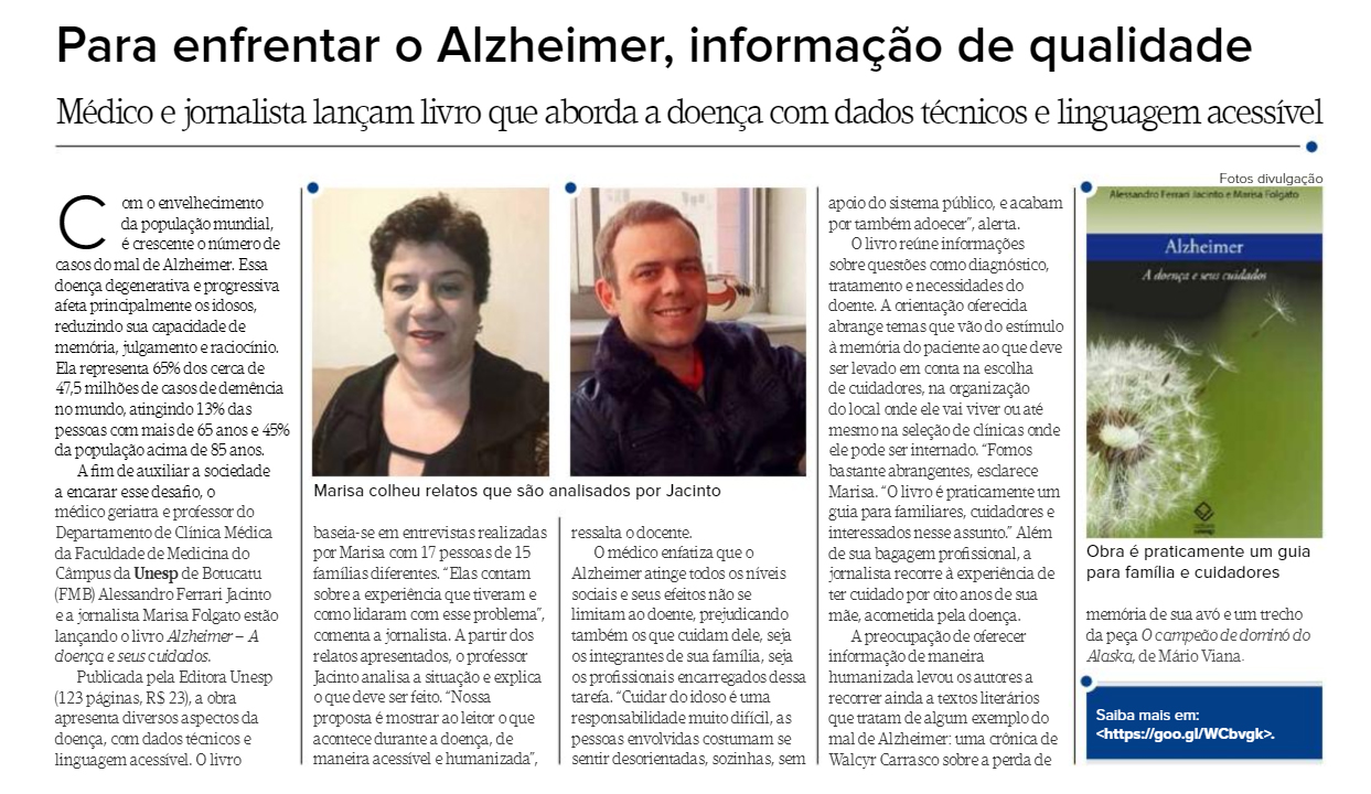 O Jornal Unesp, em sua edição de março, entrevistou Alessandro Ferrari Jacinto e Marisa Folgato, autores do livro Alzheimer: a doença e seus cuidados. A obra trata-se de um livro de histórias reais que a gente escuta cada vez com mais frequência em rodas de amigos e mesmo em conversas com desconhecidos. Relatos que invariavelmente começam com queixas sobre falhas de memória e seguem para o diagnóstico que ninguém quer ouvir: é Alzheimer.