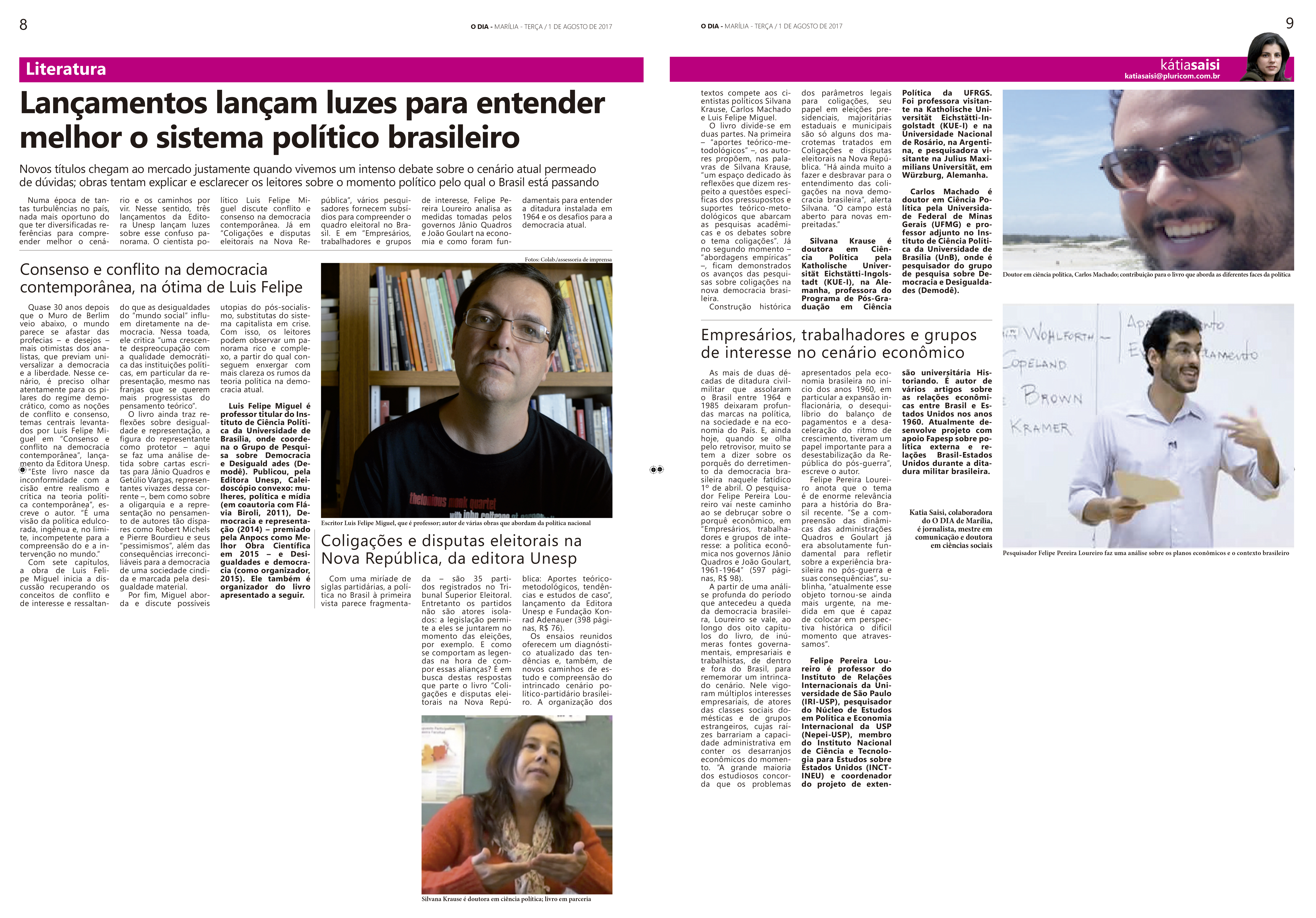 O jornal O Dia de Marília destacou, em 1° de agosto, lançamentos da Editora Unesp que abordam a política brasileira: Consenso e conflito na democracia contemporânea, de Luis Felipe Miguel, Coligações e novas disputas eleitorais na Nova República, organizado por Silvana Krause, Carlos Machado e Luis Felipe Miguel e Empresários, trabalhadores e grupos de interesse, de Felipe Pereira Loureiro.