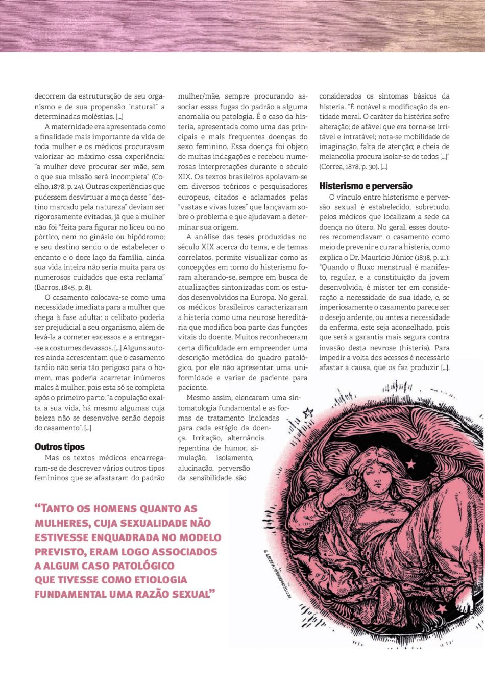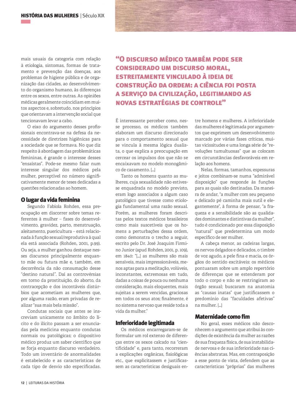O objeto do texto são os impactos das mudanças sociais sobre a condição feminina durante o Império de D. Pedro II, provocadas pela chegada da corte portuguesa ao Rio de Janeiro no início do século 19. A autora examina o que se esperava da mulher nessa nova configuração social e aborda, ainda, o modo como a medicina da época forjou o espaço de legitimadora da verdade acerca da saúde dos indivíduos, analisando também como os textos médicos descreviam a mulher.