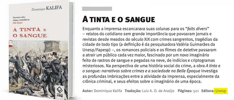 A edição de dezembro da revista Leituras da Histórias indicou a obra de Dominique Kalifa, A tinta e o sangue: narrativas sobre crimes e sociedade na Belle Époque. Na perspectiva de uma história social do crime, o livro investiga as profundas imbricações entre a atividade da imprensa, especialmente da crônica criminal, e seus efeitos sobre o imaginário de uma época.