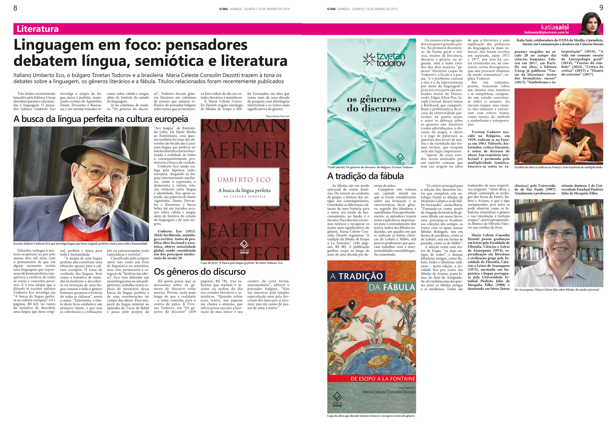 O jornal O Dia, em sua edição de 16 de janeiro, destacou os lançamentos A busca da língua perfeita na cultura europeia, de Umberto Eco; Os gêneros do discurso, de Tzvetan Todorov e A tradição da fábula, organizado por Maria Celeste Consolin Dezotti.