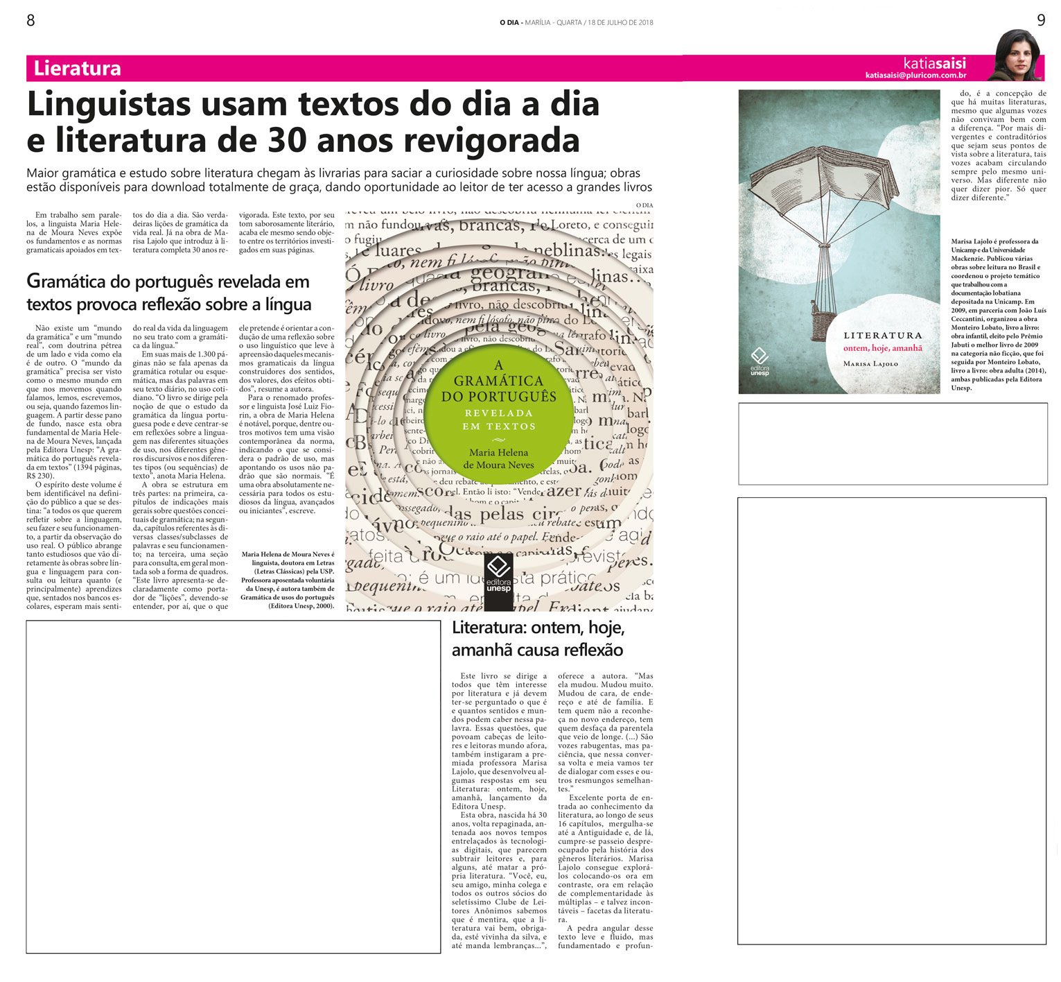 O jornal O Dia, de Marília, em sua edição de 18 de julho, destacou os lançamentos A gramática do português revelada em textos, de Maria Helena de Moura Neves e Literatura: ontem, hoje, amanhã, de Marisa Lajolo.