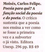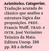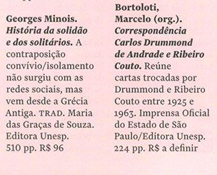O listão da revista Quatro Cinco Um, em sua edição de setembro, indicou os livros Categorias, de Aristóteles; História da solidão e dos solitários, de Georges Minois; Carlos Drummond de Andrade e Ribeiro Couto: Correspondência, organizado por Marcelo Bortoloti (em breve); Poesia para quê? A função social da poesia e do poeta, de Carlos Felipe Moisés e Dicionário de segurança e defesa, organizado por Héctor Luis Saint-Pierre e Marina Gisela Vitelli.