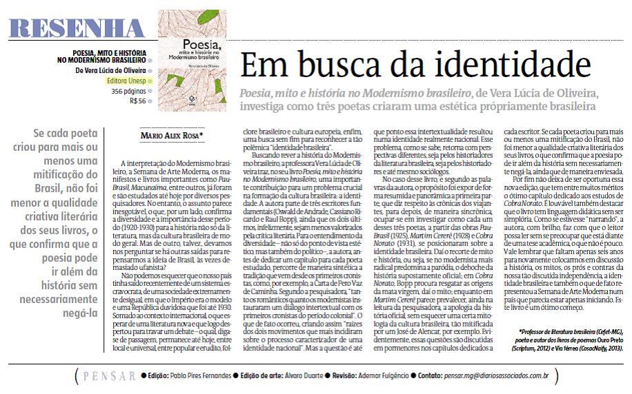 Buscando rever a história do Modernismo brasileiro, a professora Vera Lúcia de Oliveira traz, no seu livro Poesia, mito e história no Modernismo brasileiro, uma importante contribuição para um problema crucial na formação da cultura brasileira: a identidade. A autora parte de três escritores fundamentais (Oswald de Andrade, Cassiano Ricardo e Raul Bopp), ainda que os dois últimos, infelizmente, sejam menos valorizados pela crítica literária. Para o entendimento da diversidade – não só do ponto de vista estético, mas também do político –, a autora, antes de dedicar um capítulo para cada poeta estudado, percorre de maneira sintética a tradição que vem desde os primeiros cronistas, como, por exemplo, a Carta de Pero Vaz de Caminha. Segundo a pesquisadora, “tanto os românticos quanto os modernistas instauraram um diálogo intertextual com os primeiros cronistas do período colonial”. O que de fato ocorreu, criando assim “raízes dos dois movimentos que mais incidiram sobre o processo caracterizador de uma identidade nacional”. Mas a questão é até que ponto essa intertextualidade resultou numa identidade realmente nacional. Esse problema, como se sabe, retorna com perspectivas diferentes, seja pelos historiadores da literatura brasileira, seja pelos historiadores e até mesmo sociólogos.