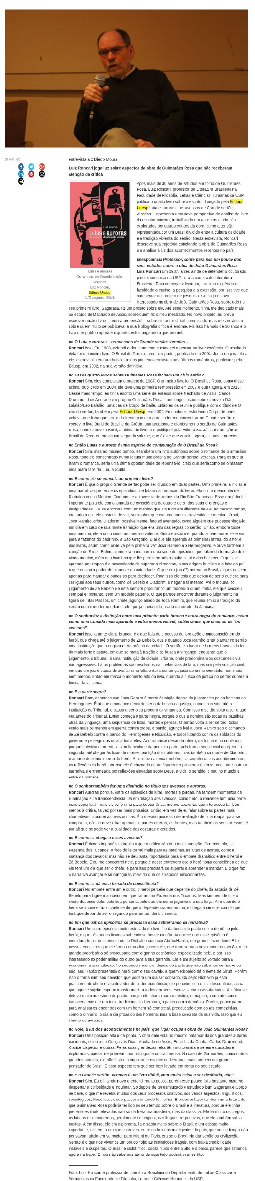 Em entrevista à Revista Unesp Ciência, Luiz Roncari joga luz sobre aspectos da obra de Guimarães Rosa que não receberam atenção da crítica. Confira reprodução a seguir ou leia diretamente no site: http://unespciencia.com.br/2018/10/31/literatura-101/