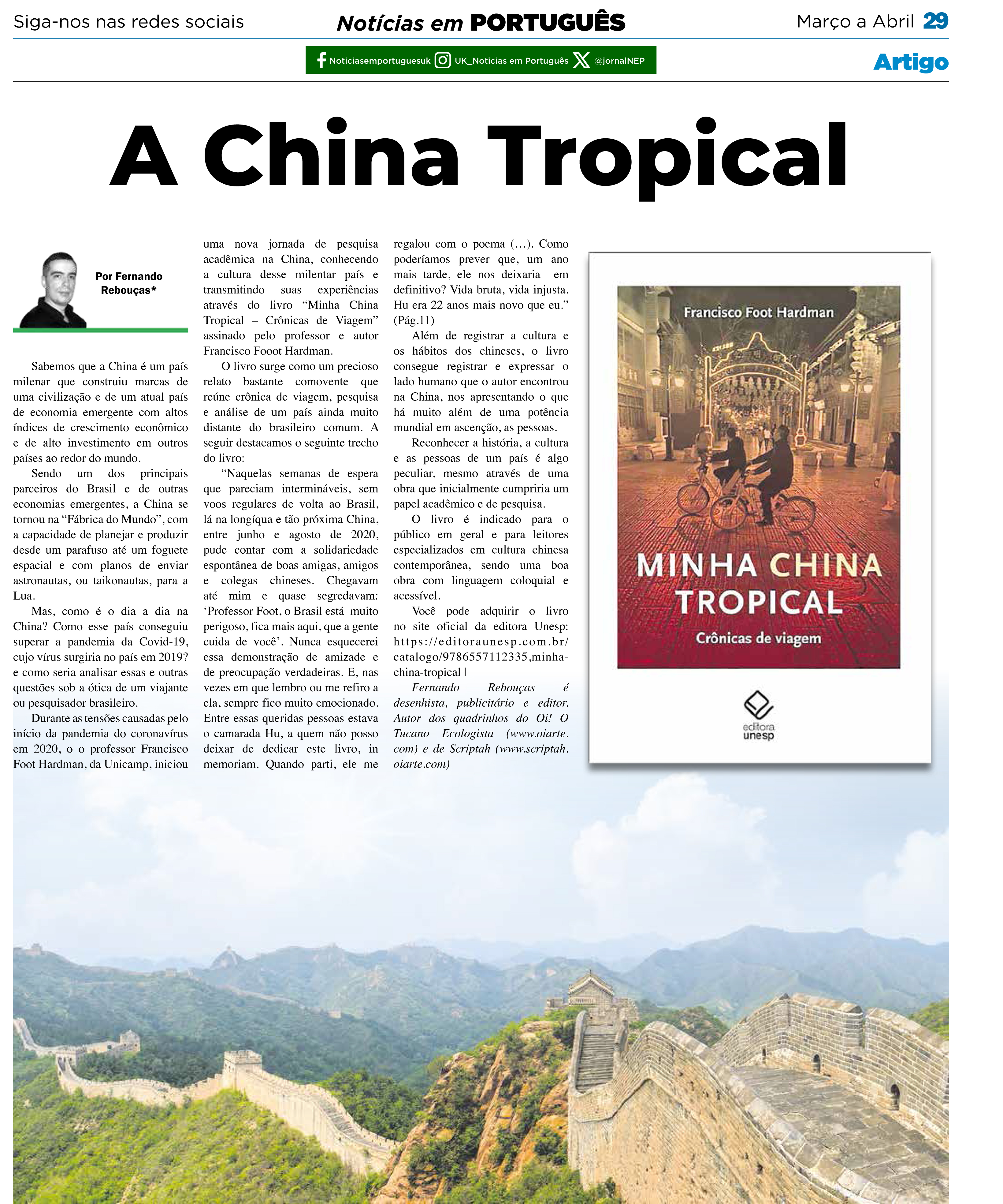 O jornal Notícias em português, que circula na comunidade brasileira em Londres, recomendou o livro Minha China tropical, do pesquisador Francisco Foot Hardman.