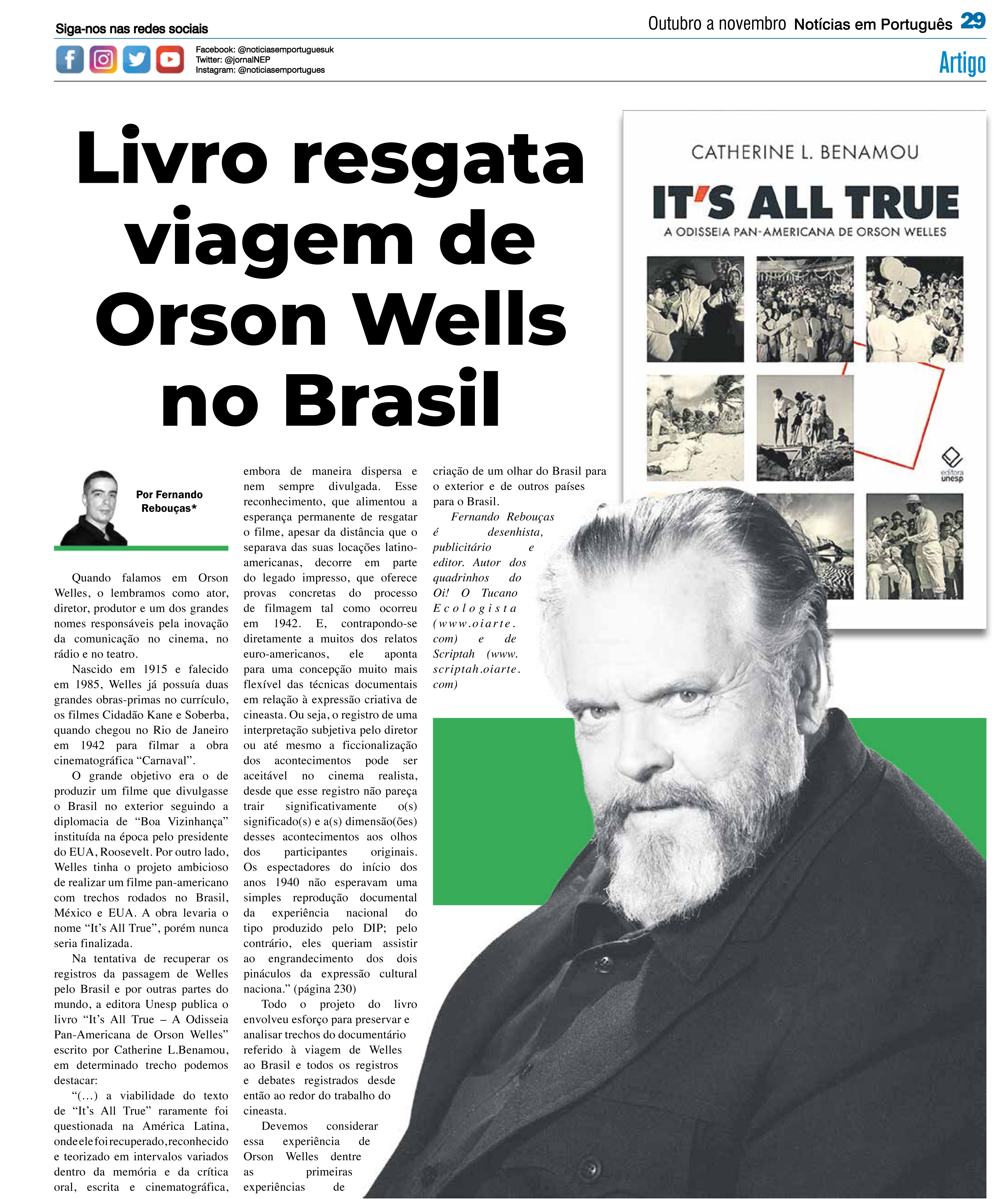 O jornal Notícias em Português, que circula entre a comunidade brasileira em Londres, indicou It’s All True: A odisseia pan-americana de Orson Welles, da pesquisadora Catherine L. Benamou e ora lançado pela Editora Unesp.
