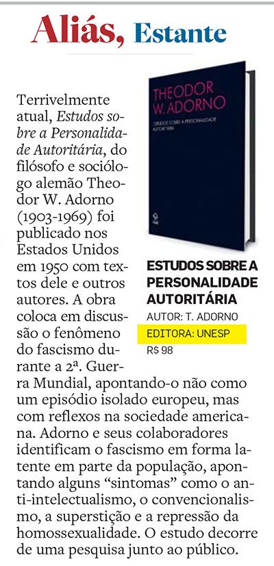 A editoria Aliás do jornal O Estado de S. Paulo indicou o lançamento da Editora Unesp Estudos sobre a personalidade autoritária, de Theodor W. Adorno. Os textos que compõem o presente livro debatem como, em plena Segunda Guerra Mundial, o fascismo não era um episódio isolado, mas estava presente de forma latente em amostras da população norte-americana da época.