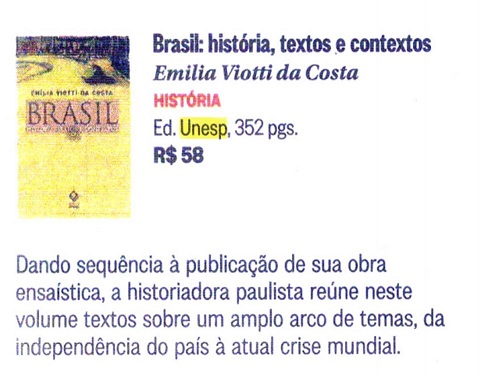Lançado em 2015, Brasil: história, textos e contextos, de Emília Viotti da Costa é destaque nos jornais O Globo e Diário do Nordeste. O livro apresenta ensaios escolhidos para cobrir um variado espectro temático que vai da independência do Brasil à crise mundial, cujos ecos ainda são sentidos e enfrentados hoje. A variedade temática da publicação, que extrapola o âmbito nacional e trata de assuntos de interesse global, com especial relevo para o continente americano, deixa patente a importância dos contextos para qualquer análise histórica.