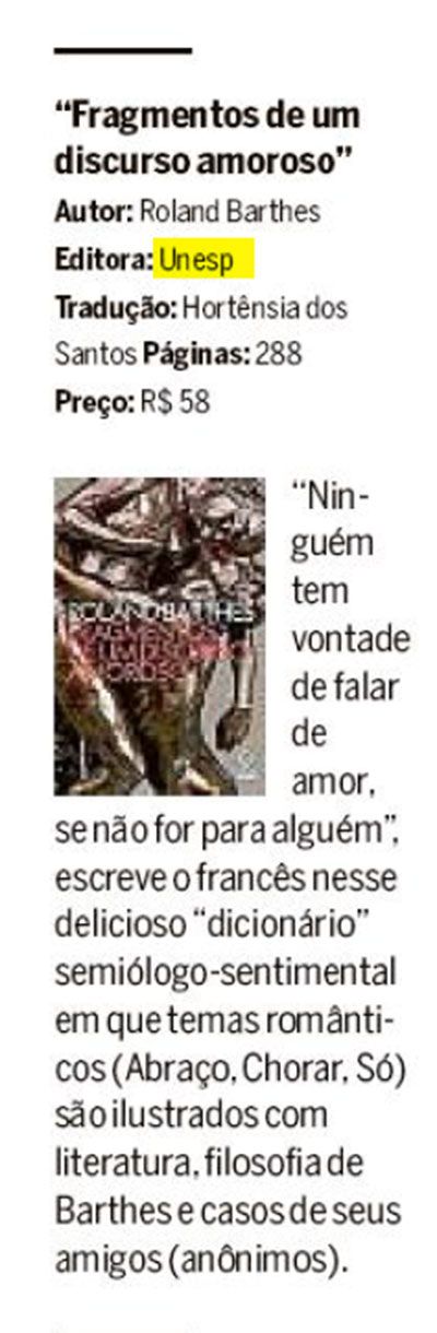 O jornal O Globo indicou a leitura do livro Fragmentos de um discurso amoroso, de Roland Barthes.