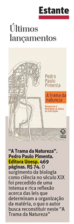 O jornal O Tempo, em sua edição de 23 de junho, destacou o lançamento A trama da natureza: organismo e finalidade na época da Ilustração, de Pedro Paulo Pimenta. O livro divide-se em duas partes. A primeira é dedicada aos modelos de organização propostos por filósofos que, na falta de um termo melhor, costumam ser chamados de “empiristas”, como Hume e Adam Smith, dentre os quais contamos também um materialista, Diderot, e dois naturalistas céticos, Buffon e Daubenton.