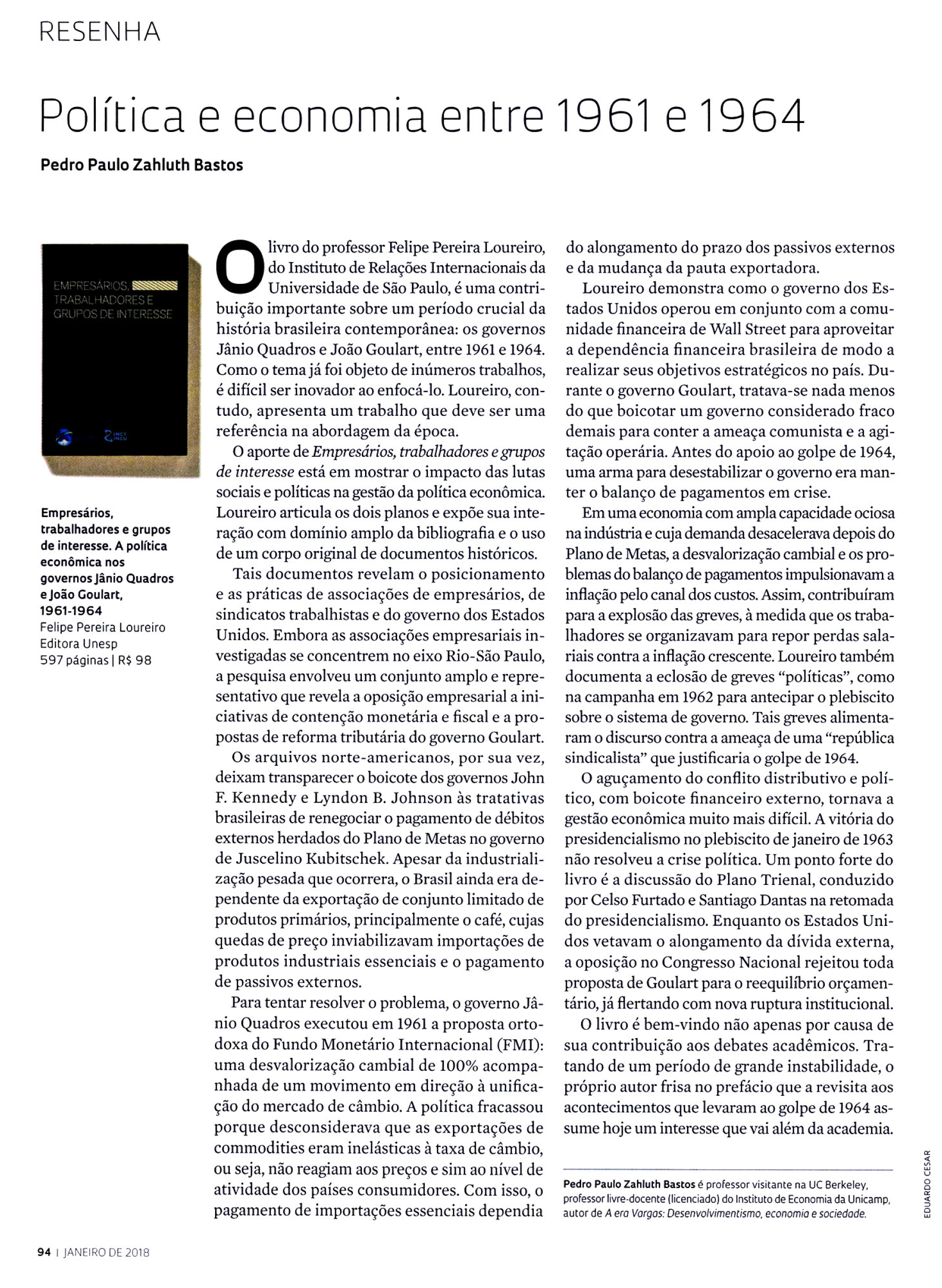 A revista Pesquisa Fapesp, em sua edição de janeiro de 2018, resenhou o livro Empresários, trabalhadores e grupos de interesse: a política econômica nos governos Jânio Quadros e João Goulart, 1961-1964, de Felipe Pereira Loureiro. O livro analisa o processo de formulação e implementação da política econômica durante os governos de Jânio Quadros e João Goulart – um dos momentos mais críticos da história brasileira do século XX. A análise é feita a partir da atuação de classes sociais domésticas e grupos de interesses estrangeiros, notadamente o governo norte-americano e o Fundo Monetário Internacional (FMI).