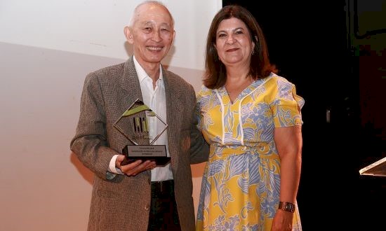 Jiro Takahashi recebe troféu das mãos da presidente da Câmara Brasileira do Livro (CBL) Sevani Matos
