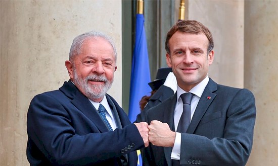 Lula é recebido pelo presidente da França, Emmanuel Macron, em visita àquele país, como parte de um giro internacional empreendido pelo petista (Foto: Ricardo Stuckert/Twitter de Lula)
