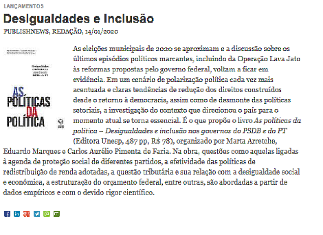 O portal PublishNews destacou o lançamento da Editora Unesp As políticas da política – Desigualdades e inclusão nos governos do PSDB e do PT, organizado por Marta Arretche, Eduardo Marques e Carlos Aurélio Pimenta de Faria.