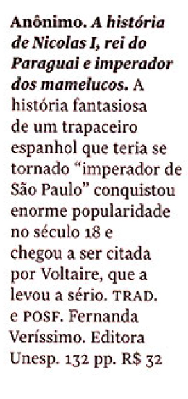 A revista Quatro Cinco Um, em sua edição de abril, recomendou os lançamento da Editora Unesp: A história de Nicolas I, Rei do Paraguai e Imperador dos Mamelucos: Seguido de Últimas notícias vindas do Paraguai, organizado por Fernanda Veríssimo, Uma visão cética do mundo: Porchat e a filosofia, de Plínio Junqueira Smith e Introdução à Sociologia da Música - 2ª edição, de Theodor W. Adorno.