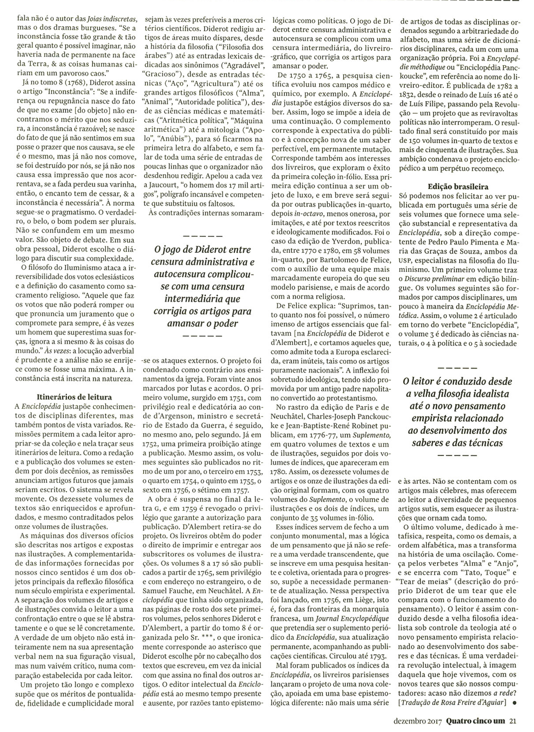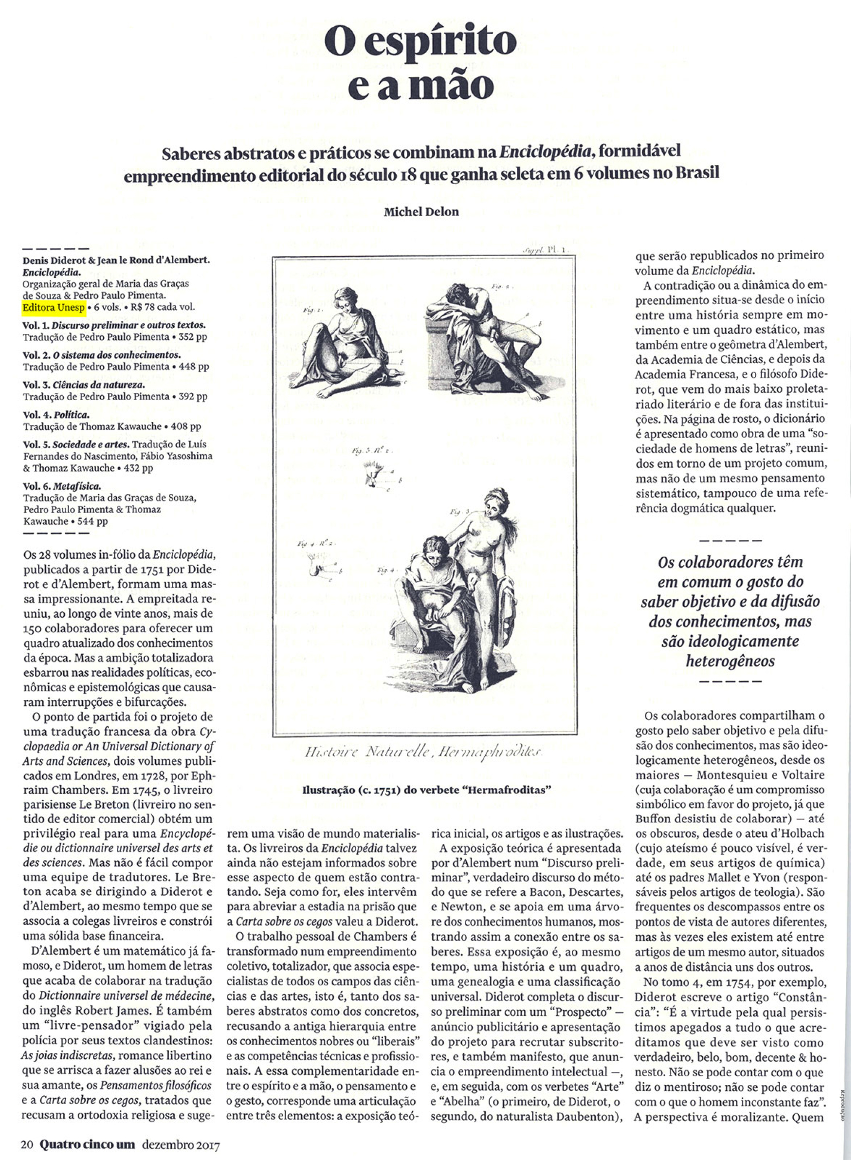 A revista Quatro Cinco Um, em sua edição de dezembro, resenhou a Coleção Enciclopédia, ou Dicionário razoado das ciências, das artes e dos ofícios, de Denis Diderot e Jean le Rond d'Alembert, organizada por Pedro Paulo Pimenta e Maria das Graças de Souza.