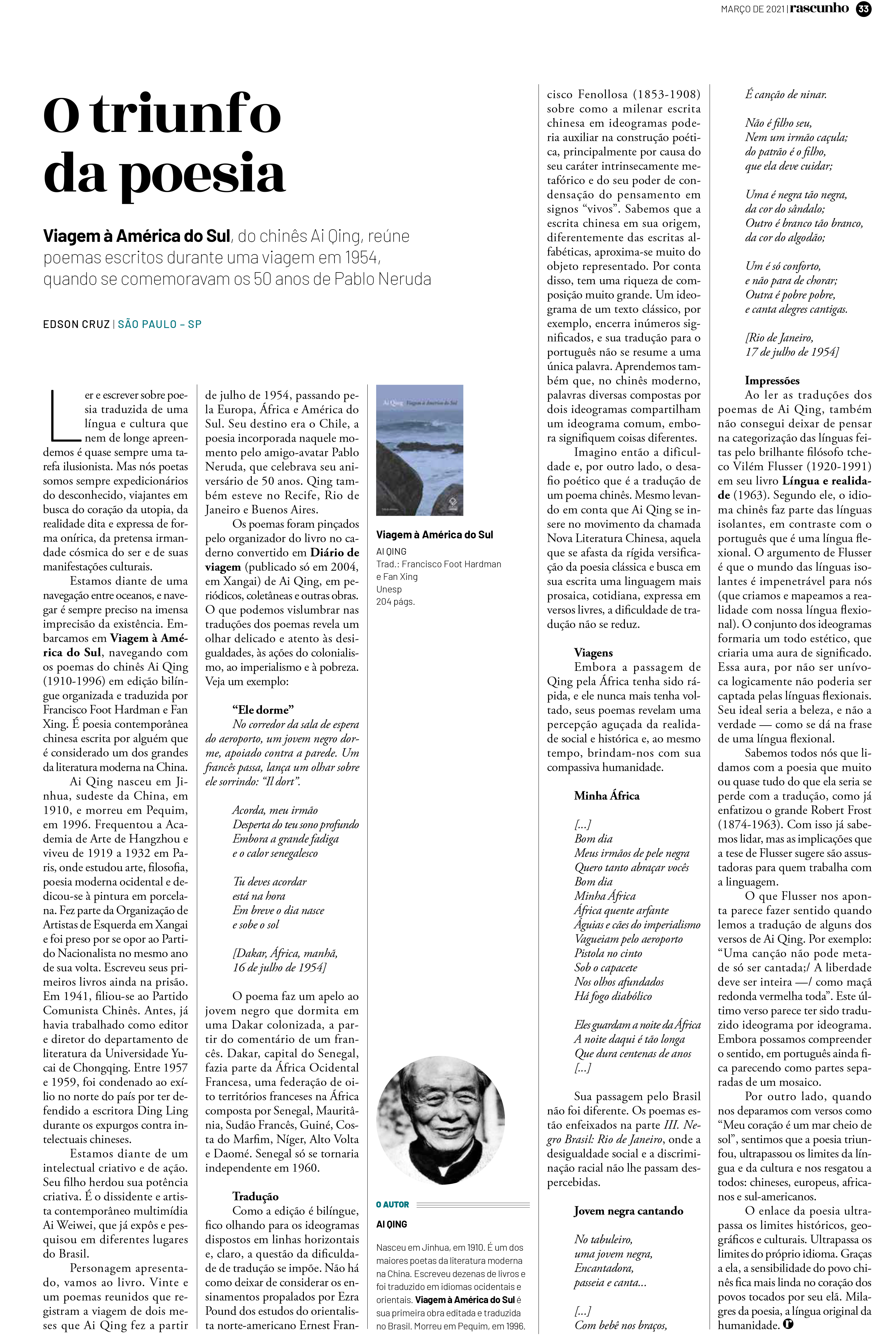 O Jornal Rascunho, publicação impressa de Curitiba (PR) dedicada à cobertura sobre literatura, destacou o livro Viagem à América do Sul, do poeta chinês Ai Qing.