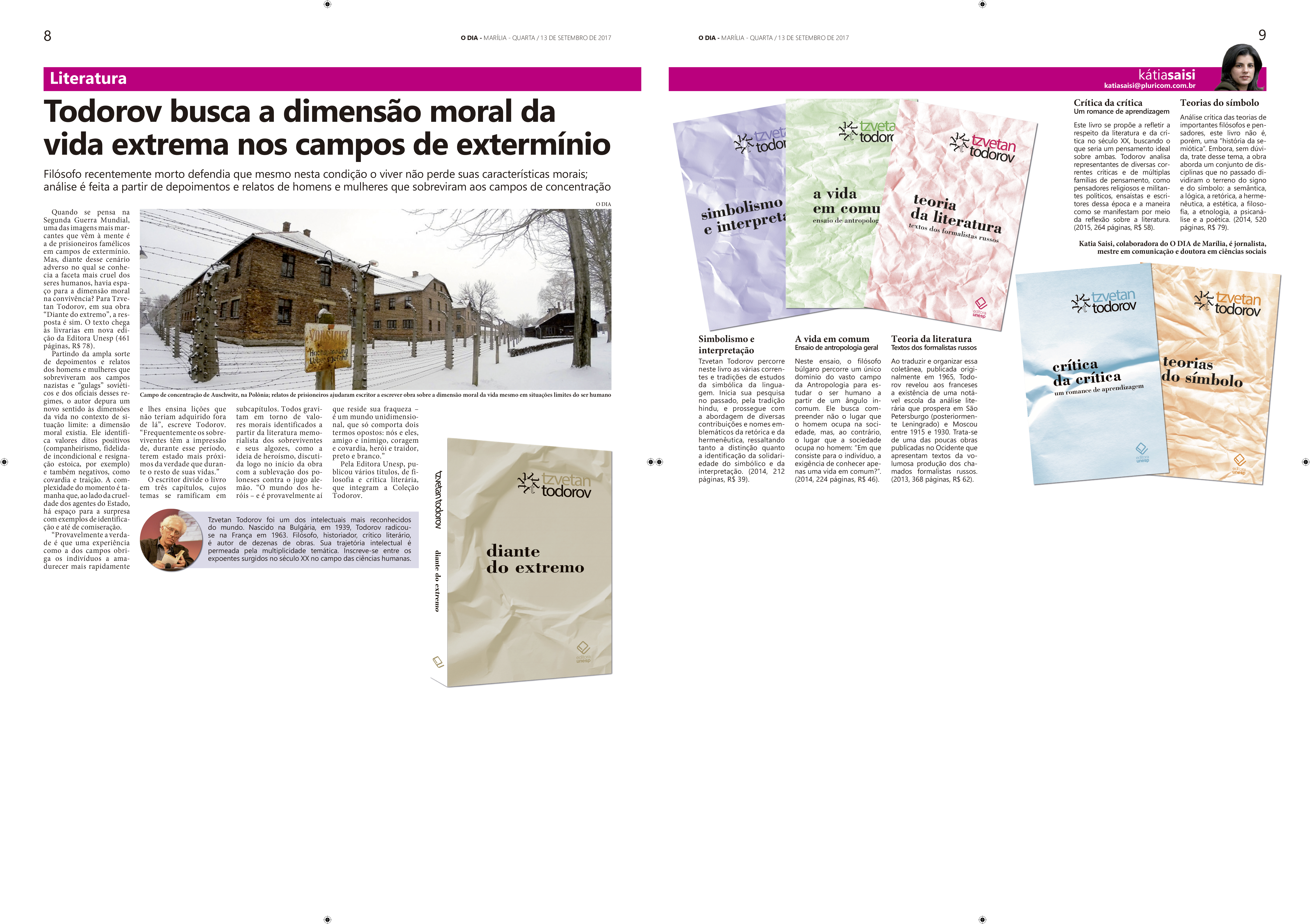 O jornal O Dia de Marília, em sua edição de 13 de setembro de 2017, destacou o lançamento de Tzvetan Todorov, Diante do extremo, além de outras obras do filósofo búlgaro publicadas pela Editora Unesp. Confira abaixo na íntegra: