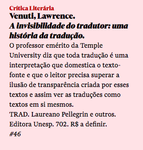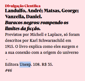 A revista Quatro Cinco Um, dedicada à divulgação de lançamentos e resenhas no mercado editorial brasileiro, trouxe em sua edição de junho, na seção Listão, três títulos da Editora Unesp: Buracos negros: Rompendo os limites da ficção, de André Landulfo, George Matsas e Daniel Vanzella; A invisibilidade do tradutor, de Laerence Venuti (em breve); e O chão da mente: a pergunta pela ficção, de Luiz Costa Lima.