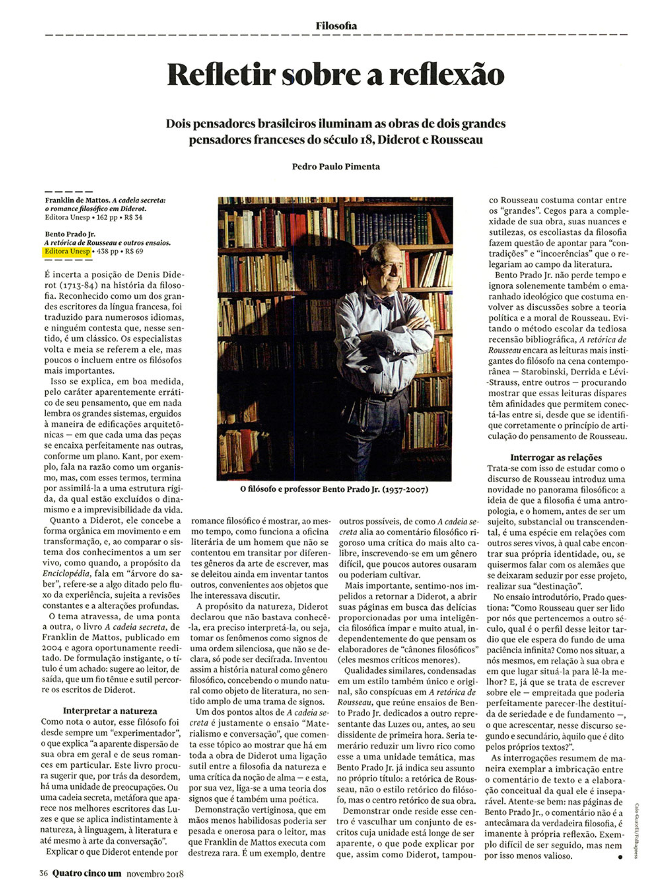 A edição de novembro da revista Quatro Cinco Um traz a resenha "Refletir sobre a reflexão", de Pedro Paulo Pimenta, sobre dois títulos da Editora Unesp lançados recentemente: A cadeia secreta: Diderot e o romance filosófico, de Franklin de Mattos, e A retórica de Rousseau e outros ensaios, de Bento Prado Jr.