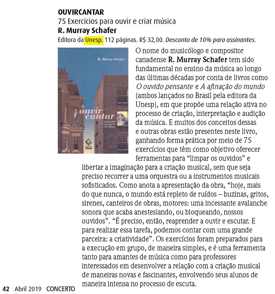 A revista Concerto destacou o lançamento OuvirCantar: 75 exercícios para ouvir e criar música, de R. Murray Schafer. A obra mostra como, no mundo atual cheio de ruídos, podemos reaprender a ouvir e a escutar.