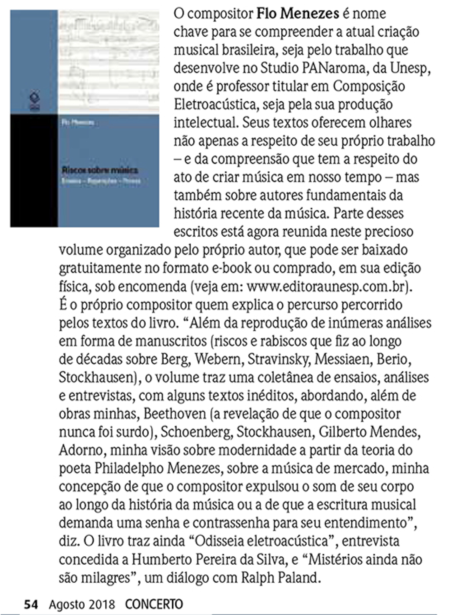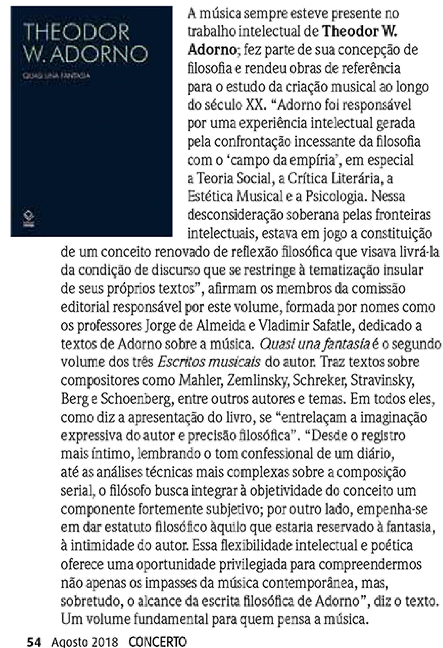 A revista Concerto, em sua edição de agosto, destacou os títulos da Editora Unesp Quasi una fantasia: Escritos musicais II, de Theodor W. Adorno e Riscos sobre música: Ensaios - Repetições - Provas, de Flo Menezes.