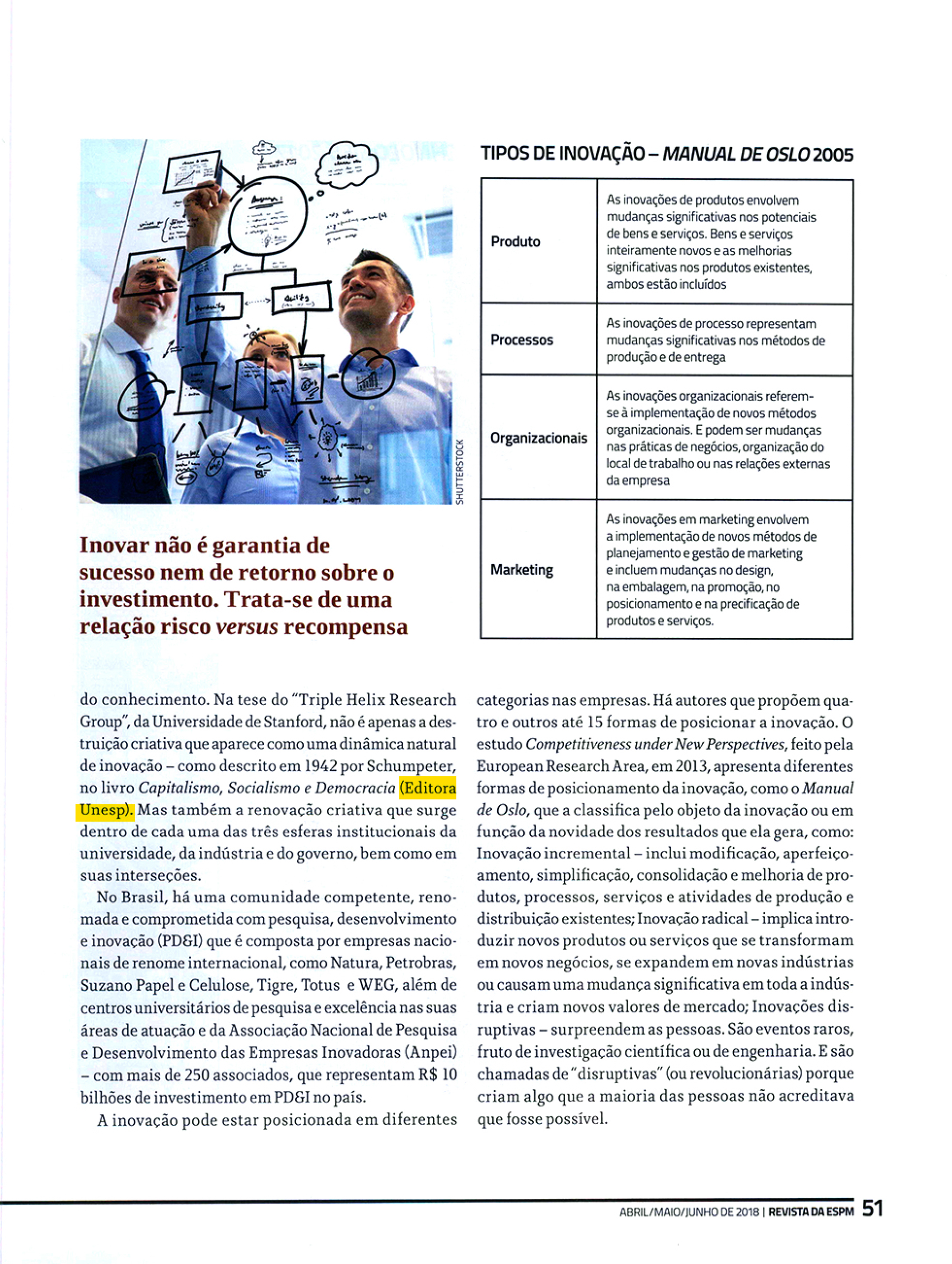 A Revista da ESPM, em matéria sobre revolução industrial e inovação, destacou o livro Capitalismo, socialismo e democracia, de Joseph A. Schumpeter. Capitalismo, socialismo e democracia é o mais famoso livro do teórico austríaco Joseph Schumpeter e a obra que torna seu pensamento inclassificável dentro de correntes econômicas hegemônicas. O autor inicia o texto com um exame crítico do marxismo, dedica-se a um longo elogio analítico do capitalismo, embora preveja razões para seu fim, e investiga as premissas do socialismo e as ligações desse sistema com a democracia.