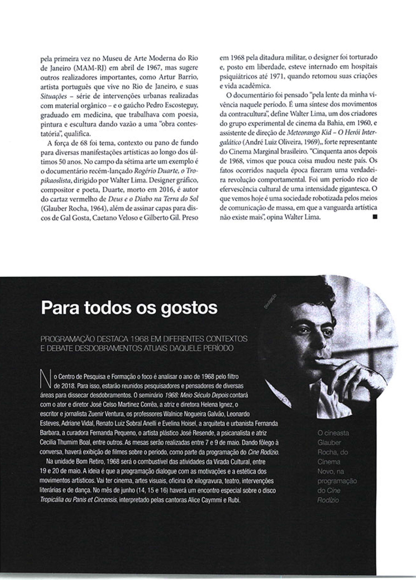 A Revista E, do Sesc São Paulo, em sua edição de maio, recomendou a leitura do livro Brutalidade jardim: a Tropicália e o surgimento da contracultura brasileira, de Christopher Dunn. No final da década de 1960, artistas brasileiros consolidaram um movimento cultural divisor de águas conhecido como Tropicália. Atualmente, a música inspirada por esse movimento tem recebido considerável atenção tanto no Brasil quanto no exterior. Poucos novos ouvintes, contudo, conhecem a relação entre essa música e as circunstâncias por trás de sua criação, a fase mais violenta e repressiva do regime militar que governou o Brasil de 1964 a 1985. Com importantes manifestações no teatro, cinema, artes visuais, literatura e especialmente na música popular, a Tropicália articulou com dinamismo os conflitos e aspirações de uma geração de jovens brasileiros urbanos.